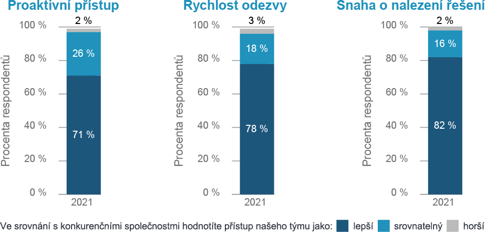 - vstále spokojenější jste s „rychlostí naší odezvy na Vaše požadavky“ – 78 % z Vás nás opět staví nad naši konkurenci,